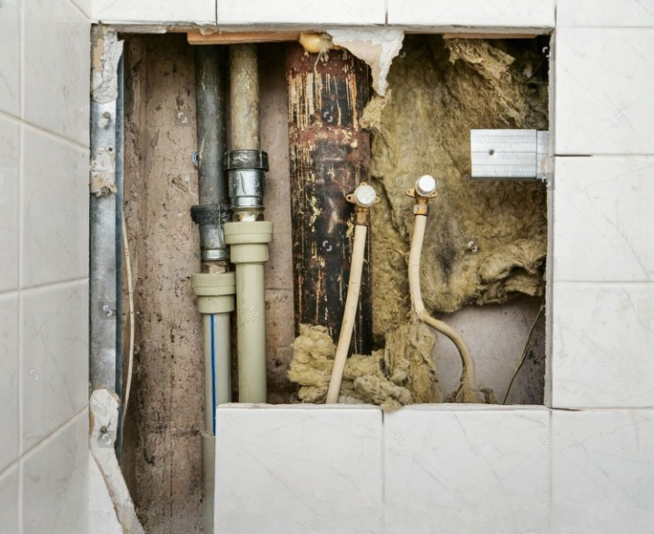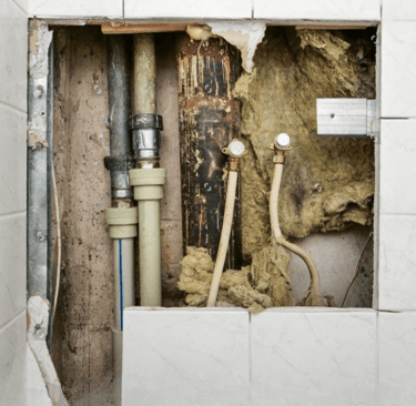 Réseau de plomberie ancien, non conforme et difficilement accessible, avec des canalisations apparentes, une isolation dégradée et un risque de dysfonctionnement.